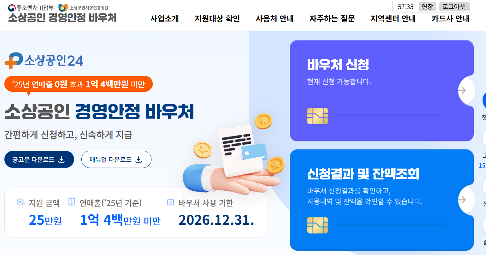 - 준비물: 1. 본인 확인을 위한 간편인증(또는 공동인증서) 2. 사업자등록증명원 3. 부가가치세 과세표준증명 (매출 증빙용) 4. 바우처를 받을 본인 명의의 신용/체크카드